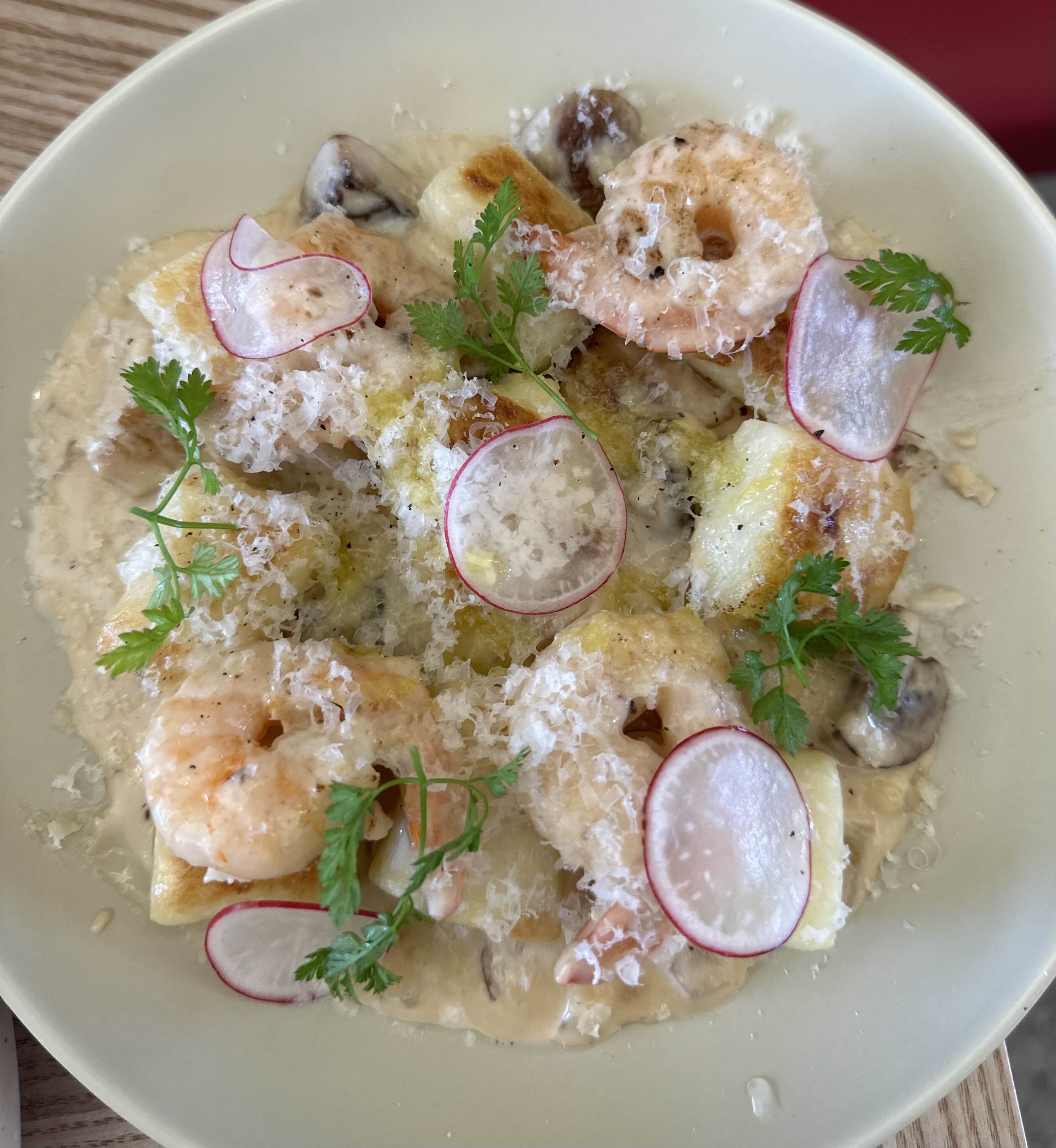 크림소스가 꾸덕꾸덕하고 요끼는 쫀득쫀득, 새우살은 탱탱해요! 버섯도 향긋하고 한꺼번에 먹으면 더 환상적인 맛이예요!!