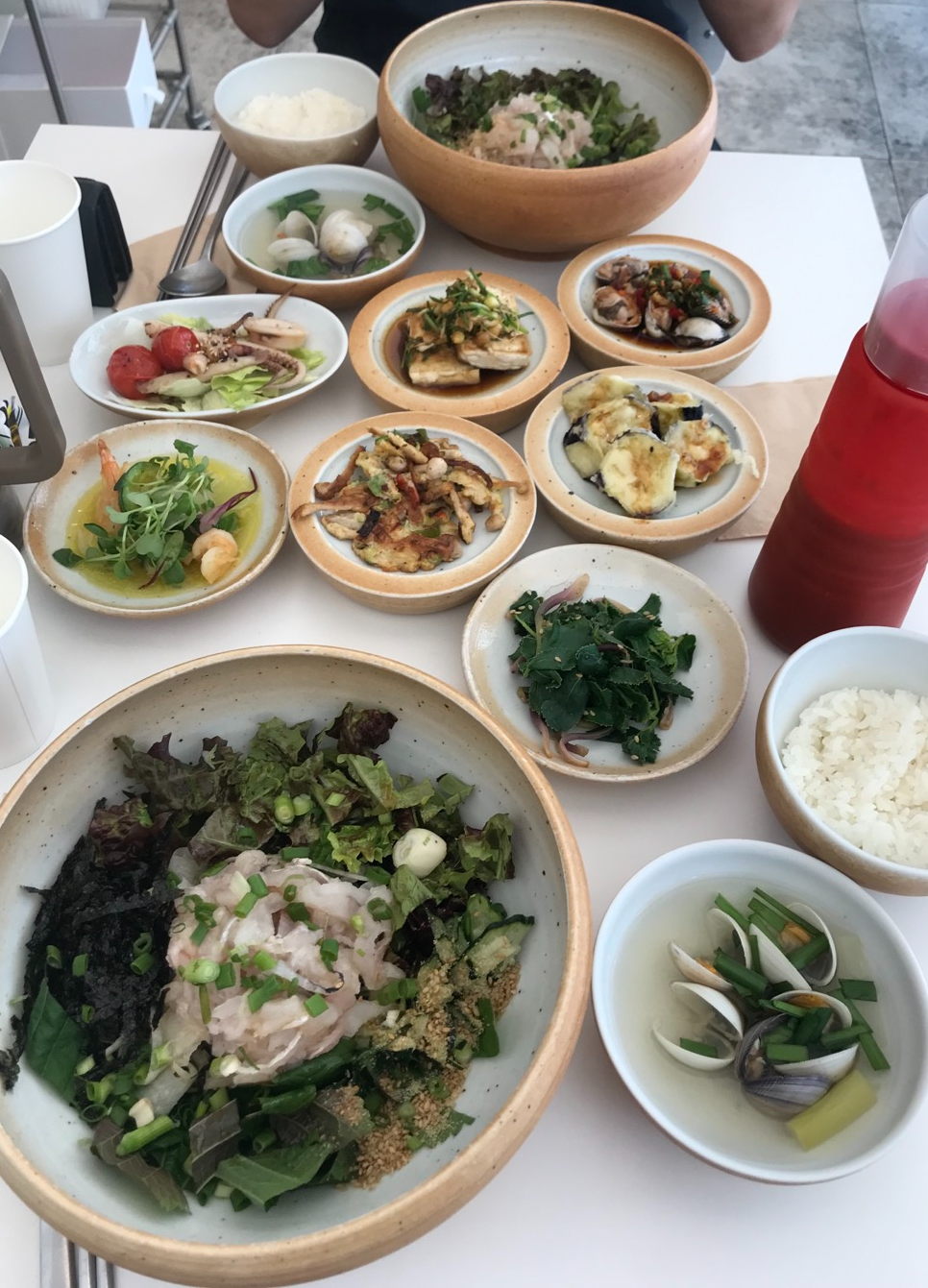 항상 기본적으로 나오는 반찬인 가지 튀김이 아주 맛있고, 부침두부와 간장양념, 꼬막, 새우가 올라간 샐러드, 그리고 시원한 맑은 조개탕이 모두 간도 알맞고 신선합니다.